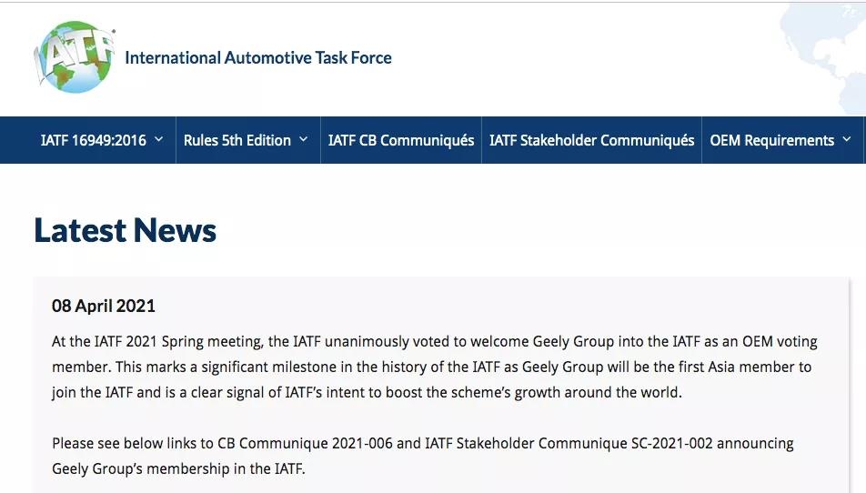 Geely is the first Asian member in the history of the IATF to have voting rights, representing Chinese automakers in the development of international standards. IATF members include five non-profit associations and nine international automakers such as Peugeot Citroën, Renault, Ford, GM, and Daimler. Geely's inclusion signifies that a Chinese automaker has for the first time entered the core circle of global automotive standards development.