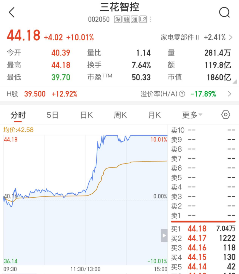 After the market opened at 1:00 PM, both Sanhua Intelligent Control's A-shares and Hong Kong-listed shares began a sharp rise. The A-shares hit their daily limit, closing at 44.18 yuan per share, with a trading volume of 11.98 billion yuan and a total market capitalization of 186 billion yuan. Hong Kong stocks also rose simultaneously, surging over 13% at one point, before closing at 39.52 Hong Kong dollars per share, a 12.98% increase, bringing the total market capitalization to 164.631 billion Hong Kong dollars.