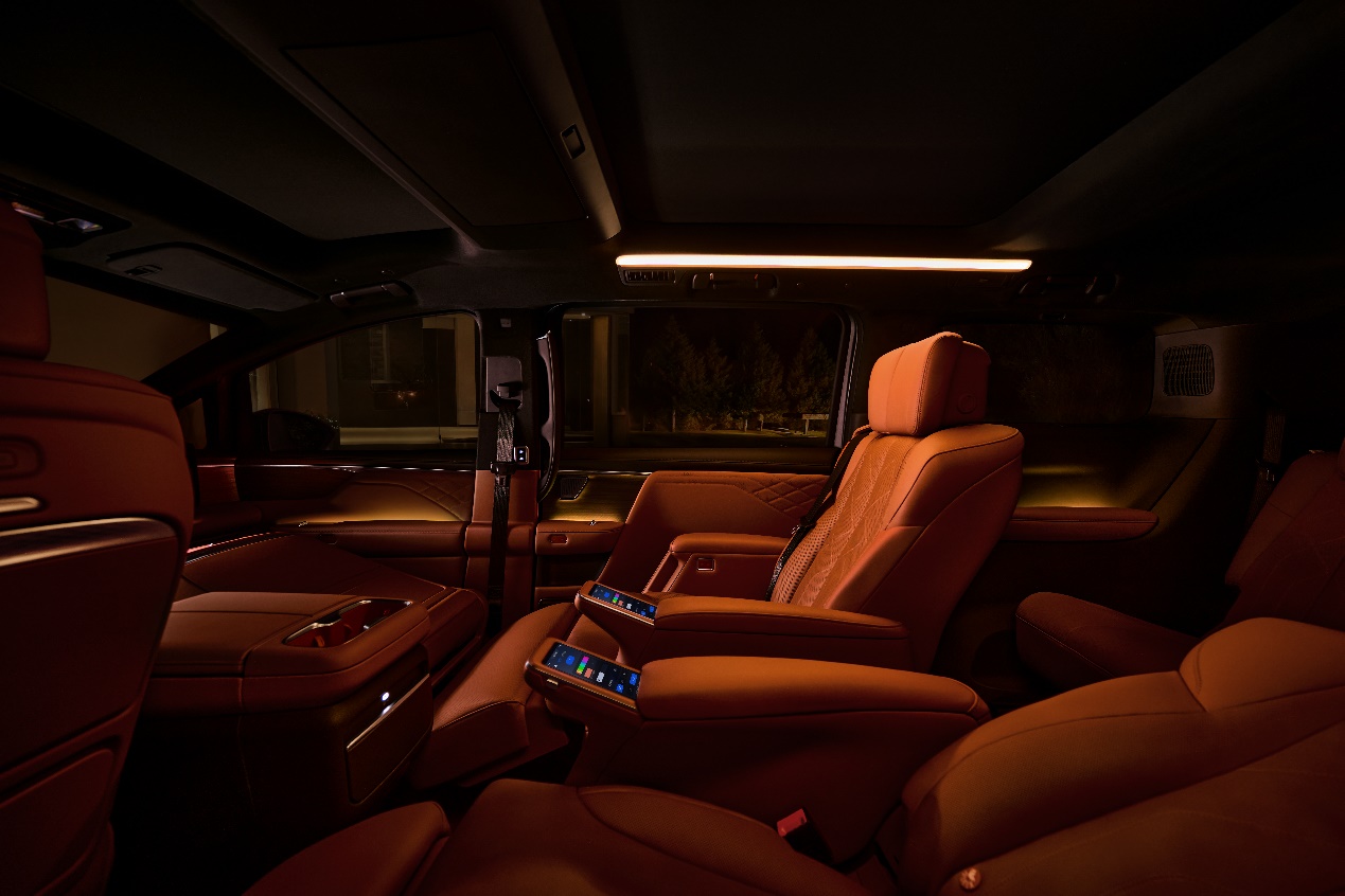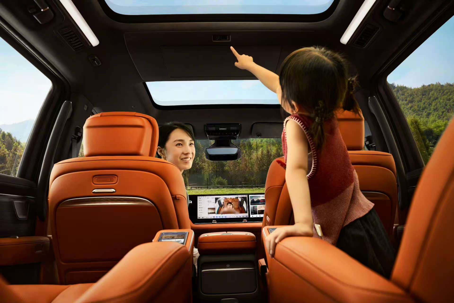The cabin of the Zhijing Shijia (至境世家) redefines the high-value travel experience with luxury and technology. The floating, wraparound layout echoes the "Flowing Island" theme, showcasing the fluidity of water and the openness of space. Combining high-end materials and meticulous craftsmanship, it highlights elegant style and exceptional taste. Three rows of full-grain Nappa leather seats, island microfiber suede headliners, and 15mm thick Australian wool carpets bring the luxurious feel of a villa into the cabin. All areas children might touch feature rounded curves and are fully wrapped in skin-friendly soft materials; a 24-hour uninterrupted cooling and heating refrigerator, four 50W wireless fast charging slots for mobile phones, multi-functional expansion interfaces on the front seatbacks, and luxurious folding tables are just some of the luxurious features that create a warm, homey atmosphere.
